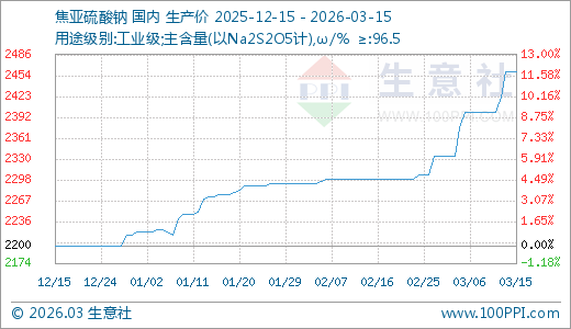 据生意社监测,焦亚硫酸钠03月15日最新价格2460.00元/吨,最近20天上涨6.96%,60天上涨8.21%,90天上涨11.82%。
