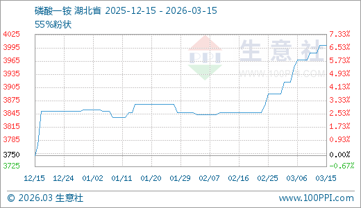 据生意社监测,磷酸一铵03月15日最新价格4000.00元/吨,最近20天上涨3.99%,90天上涨6.67%。