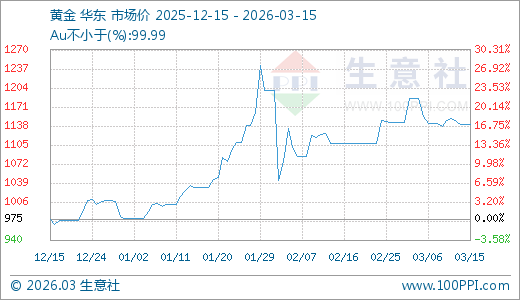 据生意社监测,黄金03月15日最新价格1140.53元/克,最近60天上涨10.22%,90天上涨16.94%。