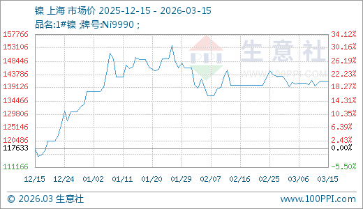 据生意社监测,镍03月15日最新价格141500.00元/吨,最近90天上涨20.29%。