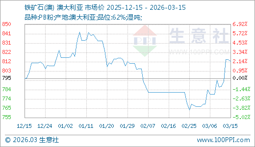 据生意社监测,铁矿石03月15日最新价格812.78元/吨,最近5天上涨3.26%,10天上涨3.69%。