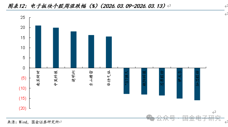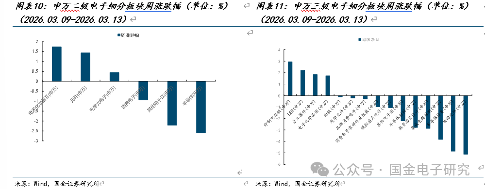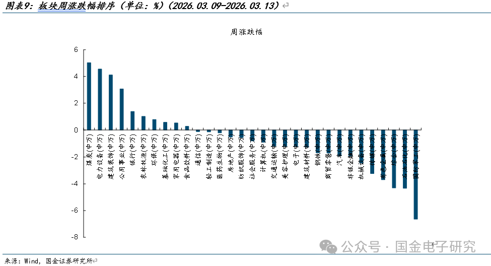 回顾本周行情,参考申万一级行业划分,涨跌幅前三名的行业分别为煤炭、电力设备、建筑装饰,涨跌幅分别为5.03%、4.55%、4.12%。涨跌幅后三位为综合、石油石化、国防军工,涨跌幅分别为-4.30%、-4.33%、-6.64%。本周电子行业涨跌幅为-1.23%。