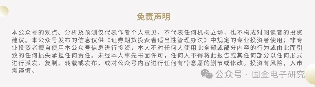 细分行业景气指标:消费电子(稳健向上)、PCB(加速向上)、半导体芯片(稳健向上)、半导体代工/设备/材料/零部件(稳健向上)、显示(底部企稳)、被动元件(稳健向上)、封测(稳健向上)。