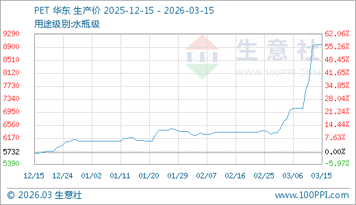 PET 03月15日最新价格8965.00元/吨,最近5天上涨18.15%,10天上涨28.21%,20天上涨41.52%,60天上涨44.89%,90天上涨56.39%。