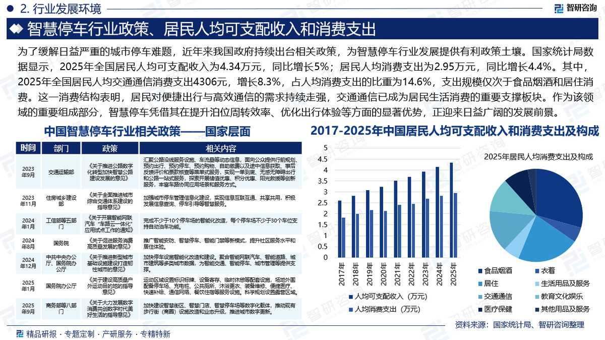 经济环境:近年来,随着我国国民经济持续增长、就业形势总体稳定、居民收入水平稳步提高,加之社会保障体系不断健全完善,居民人均可支配收入与消费支出实现同步增长。国家统计局数据显示,2025年全国居民人均可支配收入为4.34万元,同比增长5%;居民人均消费支出为2.95万元,同比增长4.4%。其中,2025年全国居民人均交通通信消费支出4306元,增长8.3%,占人均消费支出的比重为14.6%,支出规模仅次于食品烟酒和居住消费。这一消费结构表明,居民对便捷出行与高效通信的需求持续走强,交通通信已成为居民生活消费的重要支撑板块。作为该领域的重要组成部分,智慧停车凭借其在提升泊位周转效率、优化出行体验等方面的显著优势,正迎来日益广阔的发展前景。