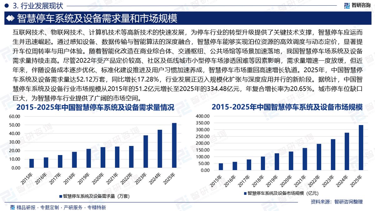 智慧停车是指以停车位资源为基础,将无线通信技术、移动终端技术、GPS定位技术、GIS技术等综合应用于城市停车位的采集、管理、查询、预订以及导航服务。智慧停车帮助车主更加便捷地获得周边停车场的空余车位信息及自动缴纳停车费,实现停车位资源利用率的最大化、停车场利润的最大化和车主停车服务的最优化。智慧停车的核心是对停车场的资源优化和整合,利用物联网、移动支付等技术优化停车流程,并通过移动互联网实现线下停车资源共享,逐渐消除车场信息系统孤岛的现象以提高停车场的利用率和用户便捷度。互联网技术、物联网技术、计算机技术等高新技术的快速发展,为停车行业的转型升级提供了关键技术支撑,智慧停车应运而生并迅速崛起。通过感知设备、数据传输与智能算法的深度融合,智慧停车能够实现泊位资源的高效调度与动态定价,显著提升车位周转率与用户体验。随着智能化改造在商业综合体、交通枢纽、公共场馆等场景加速落地,我国智慧停车场系统及设备需求量持续走高。尽管2022年受产品定价较高、社区及低线城市小型停车场渗透困难等因素影响,需求量增速一度放缓,但近年来,伴随设备成本逐步优化、标准化建设推进及用户习惯加速养成,智慧停车市场重回高速增长轨道。2025年,中国智慧停车系统及设备需求量达52.12万套,同比增长17.28%,行业发展正迈入规模化扩张与深度应用并行的新阶段。在用车群体持续扩大的背景下,我国停车场供需失衡问题日益加剧。当前停车位紧缺主要源于两大结构性矛盾:一是车位存量规模不足,难以匹配快速增长的汽车保有量;二是既有车位使用效率偏低,大量泊位存在时段性闲置与潮汐式拥挤并存的现象。因此,缓解停车难题单靠增量建设远远不够,必须同步推动存量利用效率的提升。智慧停车凭借其资源统筹、动态调度、无感通行与数据互联等核心能力,成为破解停车难的最佳技术路径,并在智慧城市建设体系中占据日益重要的战略地位。近年来,得益于社会资本的高度关注与密集布局,智慧停车系统及设备行业迎来快速发展期,市场需求持续释放,行业规模加速扩张。据统计,中国智慧停车系统及设备行业市场规模从2015年的51.2亿元增长至2025年的334.48亿元,年复合增长率为20.65%。城市停车位缺口巨大,为智慧停车行业提供了广阔的市场空间。在城市停车供需矛盾日益突出的背景下,智慧停车行业凭借其强大的市场需求与广阔的发展潜力,吸引了大量企业投身其中。当前,中国智慧停车市场整体呈现出竞争主体多元、市场集中度偏低的格局特征。由于行业进入门槛相对不高,加之各地区停车资源禀赋与管理模式差异显著,企业布局多呈现区域化、零散化特征,尚未形成全国性垄断龙头。多数企业规模较小,业务覆盖范围有限,产品与服务同质化现象较为突出,导致区域市场竞争日趋激烈。目前,我国智慧停车主要企业有北京悦畅科技有限公司、深圳市捷顺科技实业股份有限公司、深圳市道尔智控科技股份有限公司、北京数字政通科技股份有限公司、北京蓝卡科技股份有限公司、武汉爱迪科技股份有限公司、江苏五洋自控技术股份有限公司、杭州立方控股股份有限公司等。