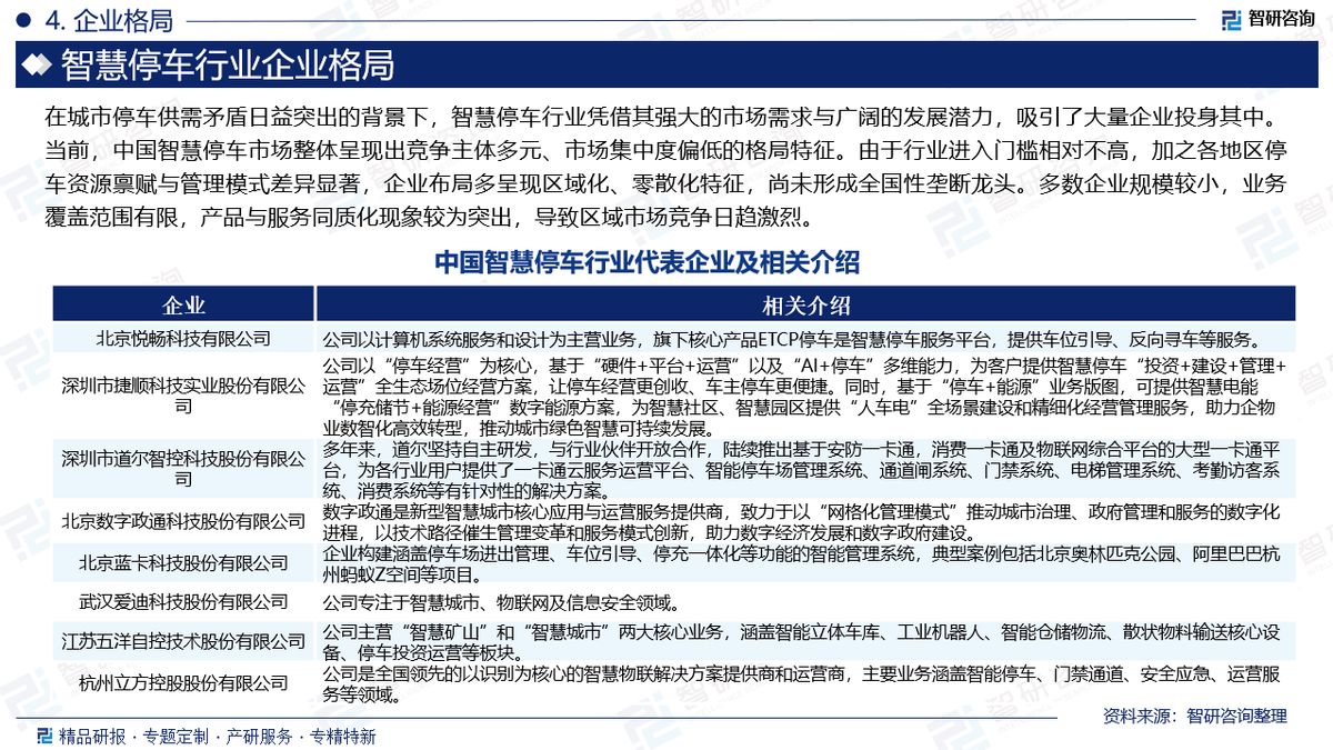 企业格局:在城市停车供需矛盾日益突出的背景下,智慧停车行业凭借其强大的市场需求与广阔的发展潜力,吸引了大量企业投身其中。当前,中国智慧停车市场整体呈现出竞争主体多元、市场集中度偏低的格局特征。由于行业进入门槛相对不高,加之各地区停车资源禀赋与管理模式差异显著,企业布局多呈现区域化、零散化特征,尚未形成全国性垄断龙头。多数企业规模较小,业务覆盖范围有限,产品与服务同质化现象较为突出,导致区域市场竞争日趋激烈。目前,我国智慧停车主要企业有北京悦畅科技有限公司、深圳市捷顺科技实业股份有限公司、深圳市道尔智控科技股份有限公司、北京数字政通科技股份有限公司、北京蓝卡科技股份有限公司、武汉爱迪科技股份有限公司、江苏五洋自控技术股份有限公司、杭州立方控股股份有限公司等。