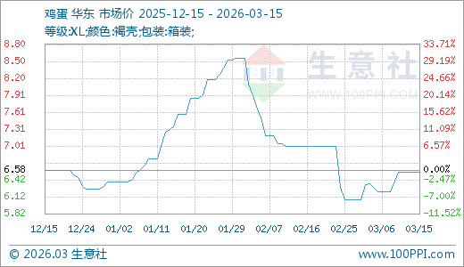 据生意社监测,鸡蛋03月15日最新价格6.55元/公斤,最近10天上涨5.65%。