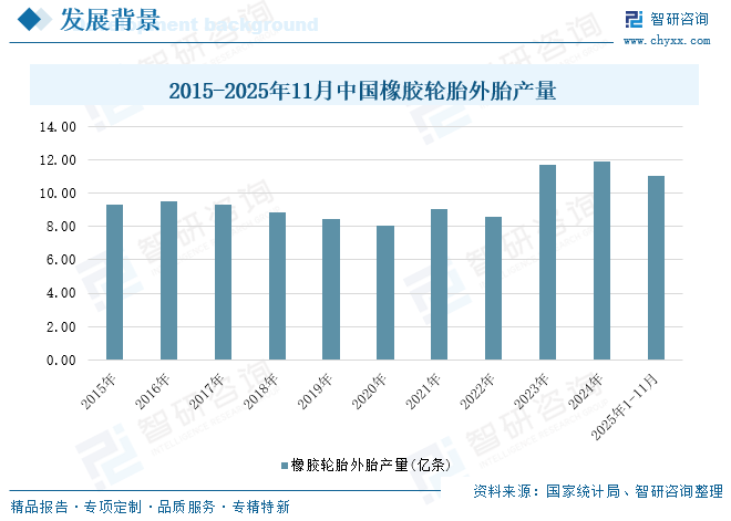 1980年,上海正泰橡胶厂引进德国二手生产线,成功实现乘用子午胎工业化生产,并配套上海大众桑塔纳,打破了国内汽车不用国产轮胎的历史,自此之后,中国轮胎产业飞速发展,米其林、固特异、普利司通等外资巨头带着资本、技术和先进模式涌入中国市场,同时诞生了玲珑轮胎、赛轮轮胎、三角轮胎、双钱轮胎等一大批国产轮胎品牌。目前,中国已成为世界上最大的轮胎生产消费国,在全球轮胎行业具有举足轻重的地位。数据显示,2024年我国橡胶轮胎外胎产量11.87亿条,同比增长1.5%,在2023年的基础上再次实现增长,创历史新高。2025年1-11月,中国橡胶轮胎外胎产量为11.03亿条,同比增长0.6%。