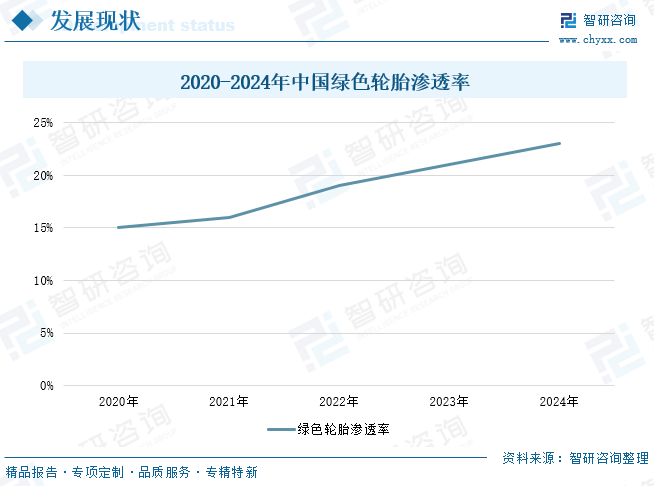 近年来,《关于加快经济社会发展全面绿色转型的意见》《关于加快推动制造业绿色化发展的指导意见》《关于实施绿色消费推进行动的通知》等一系列“绿色化”政策的出台,极大地提升了全社会环保意识,带动绿色轮胎渗透率明显提升,2024年销售占比已经达到23%,相较2020年增长8个百分点。同时,生物基香蕉、二氧化硅等环保原材料需求逐渐提高,环保属性成为品牌溢价的新支点。