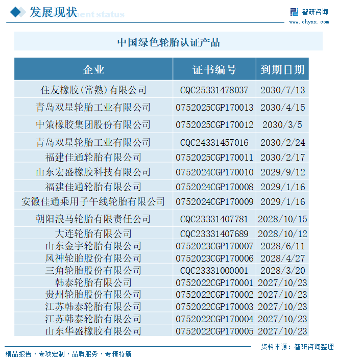 截至2025年末,我国绿色轮胎产品有效认证数量为18个,涉及住友橡胶(常熟)有限公司、中策橡胶集团股份有限公司、青岛双星轮胎工业有限公司、山东宏盛橡胶科技有限公司、福建佳通轮胎有限公司等15家企业,其中青岛双星轮胎工业有限公司、福建佳通轮胎有限公司、江苏韩泰轮胎有限公司均获得2个绿色产品认证。