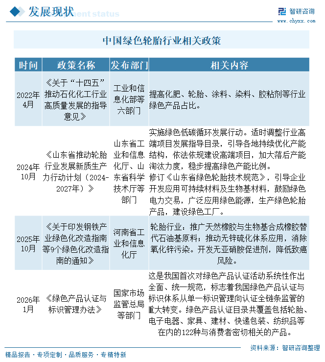 中国市场,一方面,中央及地方政府纷纷出台政策,支持绿色轮胎发展,如工信部等六部门印发的《关于“十四五”推动石化化工行业高质量发展的指导意见》,明确提出要提高化肥、轮胎、涂料、染料、胶粘剂等行业绿色产品占比。山东省发布的《山东省推动轮胎行业发展新质生产力行动计划(2024-2027年)》,提出实施绿色低碳循环发展行动。另一方面,我国不断完善绿色产品认证制度与监管体系,推动相关行业规范化发展。如2026年1月,市场监管总局会同有关部门修订发布《绿色产品认证与标识管理办法》。这是我国首次对绿色产品认证活动系统性作出全面、统一规范,标志着我国绿色产品认证与标识体系从单一标识管理向认证全链条监管的重大转变。政策推动下,轮胎企业正加速向绿色制造转型,包括使用可持续材料、降低生产能耗、开发低碳产品等。