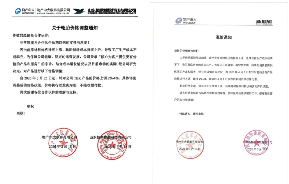 截至目前,全国范围内已有30余家轮胎厂商,发布了调价通知。