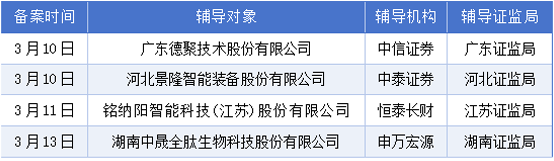 3月9日至3月15日期间新增辅导备案企业4家,分别为广东德聚技术股份有限公司、河北景隆智能装备股份有限公司、铭纳阳智能科技(江苏)股份有限公司、湖南中晟全肽生物科技股份有限公司。