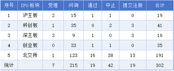 截至3月15日,IPO排队企业302家,其中沪主板排队企业19家,科创板排队企业41家,深主板排队企业16家,创业板排队企业35家,北交所排队企业191家。