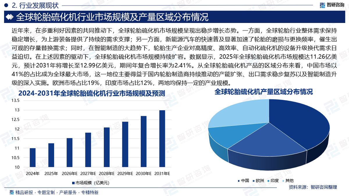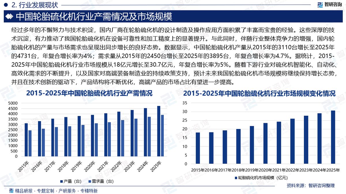 基于此,依托智研咨询旗下轮胎硫化机行业研究团队深厚的市场洞察力,并结合多年调研数据与一线实战需求,智研咨询推出《2026-2032年中国轮胎硫化机行业市场现状分析及投资前景评估报告》。本报告立足轮胎硫化机新视角,聚焦行业核心议题——变化趋势(怎么变)、用户需求(要什么)、投放选择(投向哪)、运营方法(如何投)及实践案例(看一看),期待携手行业伙伴,共谋行业发展新格局、新机遇,推动轮胎硫化机行业发展。深耕中国轮胎硫化机领域十余年,智研咨询愿携手行业企业,提供有效信息、专业咨询及定制化解决方案,助力轮胎硫化机产业持续发展。