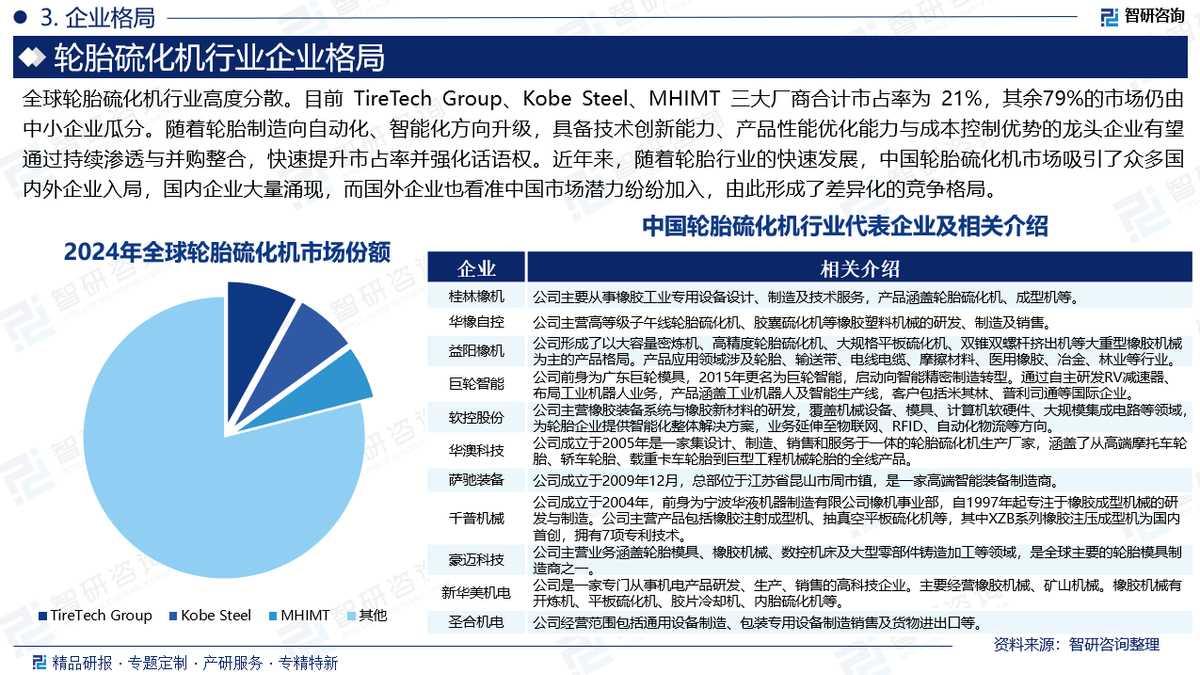 轮胎硫化机是用于轮胎硫化的专用设备,主要应用于乘用车及轻中型卡车轮胎生产,通过液压系统与高温高压(140-180℃、1.5-2.5MPa)实现橡胶硫化成型。轮胎硫化机分为机械式与液压式两类:机械式采用曲柄连杆机构,能耗低但精度易衰减;液压式通过油压系统施压,具备合模精度高(平行度≤0.3mm/m)、热损耗少(减少30%-50%)及自动化集成优势,逐渐成为主流机型。近年来,在多重利好因素的共同推动下,全球轮胎硫化机市场规模呈现出稳步增长态势。一方面,全球轮胎行业整体需求保持稳定增长,为上游装备提供了持续的需求支撑;另一方面,新能源汽车的快速普及显著加速了轮胎的磨损与更换频率,催生出可观的存量替换需求;同时,在智能制造的大趋势下,轮胎生产企业对高精度、高效率、自动化硫化机的设备升级换代需求日益迫切。在上述因素的驱动下,全球轮胎硫化机市场规模持续扩容。数据显示,2025年全球轮胎硫化机市场规模达11.26亿美元,预计2031年将增长至12.99亿美元,期间年复合增长率为2.41%。数据显示,中国轮胎硫化机产量从2015年的3110台增长至2025年的4731台,年复合增长率为4%;需求量从2015年的2450台增长至2025年的3895台,年复合增长率为4.7%。随着国内轮胎行业的持续扩张以及技术升级需求的不断释放,我国对轮胎硫化机的需求仍将保持较为强劲的增长势头,未来市场具备较大的上升空间。据统计,2015-2025年中国轮胎硫化机行业市场规模从18亿元增长至30.7亿元,年复合增长率为5%。随着下游行业对硫化机智能化、自动化、高效化需求的不断提升,以及国家对高端装备制造业的持续政策支持,预计未来我国轮胎硫化机市场规模将继续保持增长态势,并且在技术创新的驱动下,产品结构将不断优化,高端产品的市场占比有望进一步提高。全球轮胎硫化机行业高度分散。目前 TireTech Group、Kobe Steel、MHIMT 三大厂商合计市占率为 21%,其余79%的市场仍由中小企业瓜分。随着轮胎制造向自动化、智能化方向升级,具备技术创新能力、产品性能优化能力与成本控制优势的龙头企业有望通过持续渗透与并购整合,快速提升市占率并强化话语权。目前 TireTech Group、Kobe Steel、MHIMT 三大厂商分别占比8%、7%、6%,未来存在较大增长空间。近年来,随着轮胎行业的快速发展,中国轮胎硫化机市场吸引了众多国内外企业入局,国内企业大量涌现,而国外企业也看准中国市场潜力纷纷加入,由此形成了差异化的竞争格局。目前,国外企业凭借先进的技术和品牌优势,主要占据高端市场;国内企业则依托成本优势和本土化服务,主要在中低端市场占据主导地位。与此同时,随着全球汽车产量和保有量的持续增长,轮胎市场需求不断扩大,叠加欧美等发达国家人力成本居高不下以及天然橡胶主产区位于东南亚等因素,集资本、人力与技术密集于一体的轮胎产业正加速向亚洲发展中国家转移。轮胎产业的稳步增长,有力带动了上游轮胎硫化机行业的发展。在此背景下,国内部分领先企业通过持续扩大产能规模和提升市场份额,在行业竞争中逐步脱颖而出,推动中国轮胎硫化机行业形成以少数优势企业为主导、内外资品牌分层竞争的格局。当前,中国轮胎硫化机行业代表企业包括桂林橡机、华橡自控、益阳橡机、巨轮智能、软控股份、华澳科技、萨驰装备、千普机械、豪迈科技、新华美机电、圣合机电等。