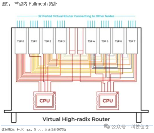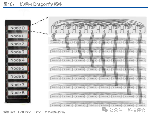 节点内Fullmesh拓扑,机柜内Dragonfly拓扑。在Node中,8张GroqCard通过线缆构成一个Fullmesh的结构,每张卡顶部有7个互联接口,通过线缆链接到其他7张卡;每张GroqCard背板位置有4个接口用于链接其他Node,并构成一个Dragonfly拓扑。