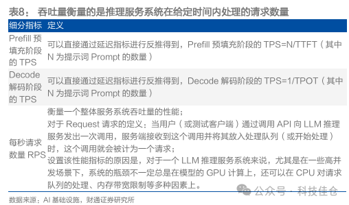 吞吐量Throughput指标衡量推理服务系统在给定时间内处理的请求或令牌数量,可以细化分为每秒Token数(Tokens Per Second,TPS,又可以继续细分为Prefill预填充阶段的TPS和Decode解码阶段的TPS)、每秒请求数量(Requests Per Second,RPS)。