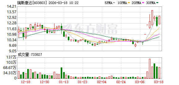 瑞斯康达再度涨停,7个交易日内录得4个涨停,累计涨幅为31.30%,累计换手率为112.51%。截至9:44,该股今日成交量4155.65万股,成交金额5.26亿元,换手率9.78%。最新A股总市值达55.79亿元。