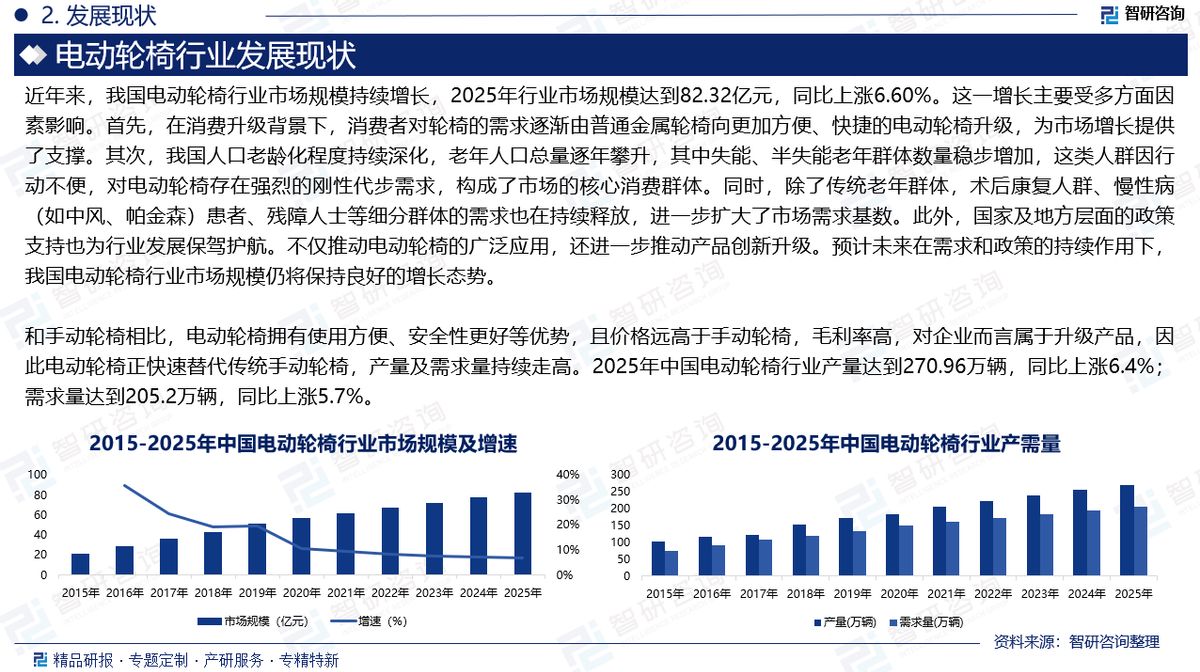 电动轮椅是在传统手动轮椅的基础上,叠加高性能动力驱动装置、智能操纵装置、电池等部件,改造升级而成的。具备人工操纵智能控制器,就能驱动轮椅完成前进、后退、转向、站立、平躺、等多种功能的新一代智能化轮椅,是现代精密机械、智能数控、工程力学等领域相结合的高新科技产品。近年来,我国电动轮椅行业市场规模持续增长,2025年行业市场规模达到82.32亿元,同比上涨6.60%。这一增长主要受多方面因素影响。首先,在消费升级背景下,消费者对轮椅的需求逐渐由普通金属轮椅向更加方便、快捷的电动轮椅升级,为市场增长提供了支撑。其次,我国人口老龄化程度持续深化,老年人口总量逐年攀升,其中失能、半失能老年群体数量稳步增加,这类人群因行动不便,对电动轮椅存在强烈的刚性代步需求,构成了市场的核心消费群体。同时,除了传统老年群体,术后康复人群、慢性病(如中风、帕金森)患者、残障人士等细分群体的需求也在持续释放,进一步扩大了市场需求基数。此外,国家及地方层面的政策支持也为行业发展保驾护航。不仅推动电动轮椅的广泛应用,还进一步推动产品创新升级。预计未来在需求和政策的持续作用下,我国电动轮椅行业市场规模仍将保持良好的增长态势。
