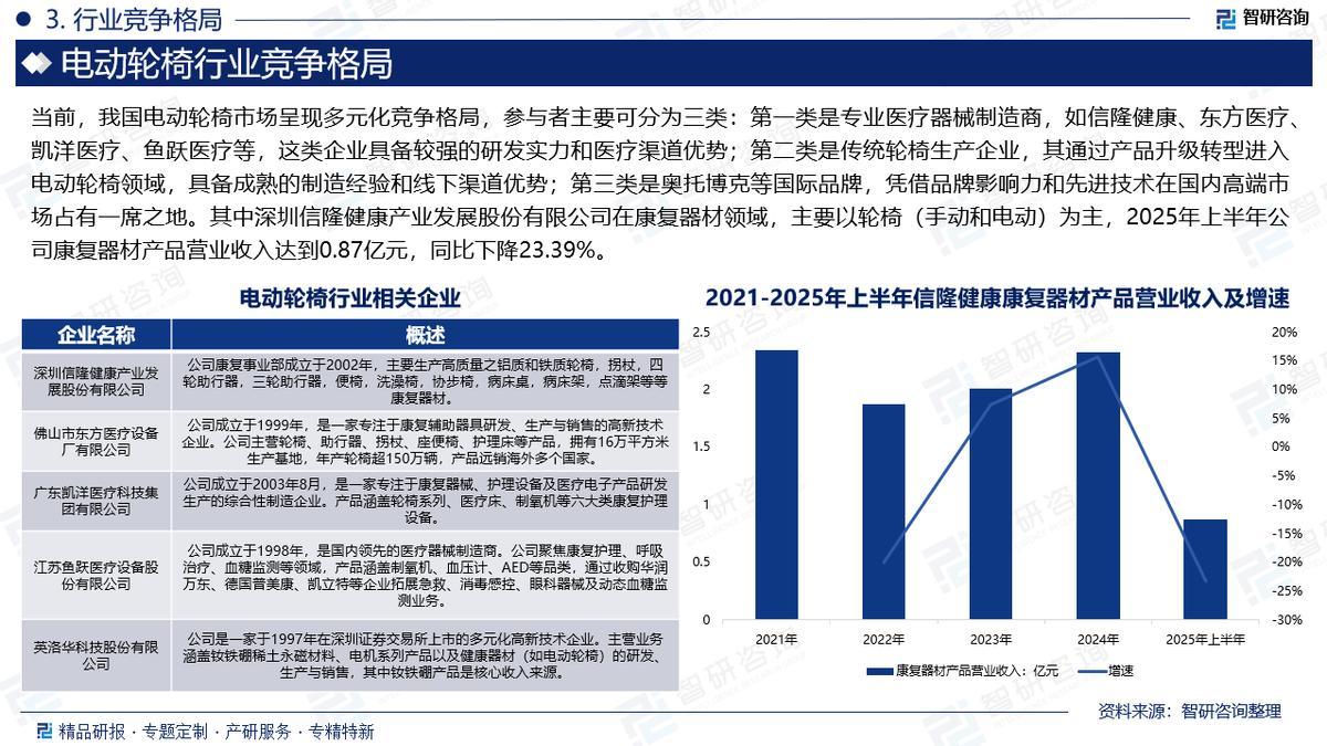 竞争格局:当前,我国电动轮椅市场呈现多元化竞争格局,参与者主要可分为三类:第一类是专业医疗器械制造商,如信隆健康、东方医疗、凯洋医疗、鱼跃医疗等,这类企业具备较强的研发实力和医疗渠道优势;第二类是传统轮椅生产企业,其通过产品升级转型进入电动轮椅领域,具备成熟的制造经验和线下渠道优势;第三类是奥托博克等国际品牌,凭借品牌影响力和先进技术在国内高端市场占有一席之地。