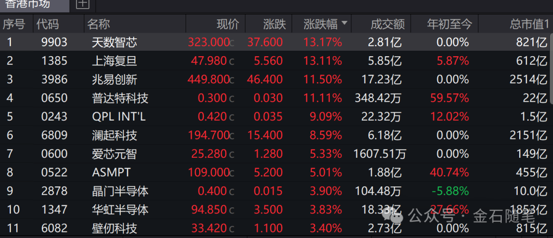 港股方面,天数智芯、上海复旦、兆易创新等暴涨超10%,澜起科技也涨8.59%。