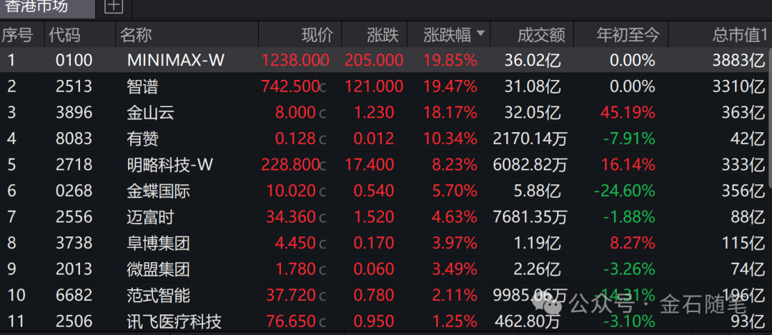 港股一大批token概念爆发式上涨,最强要属minimax和智谱两只大模型稀有股票,两只股票均涨幅近20%,且两只大模型携手创下了历史新高。两者市值不仅超过了百度、京东,也超过了泡泡玛特、中信证券、国泰海通等一众明星股。