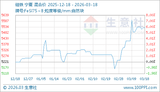 据生意社监测,硅铁03月18日最新价格5528.57元/吨,最近20天上涨6.52%。