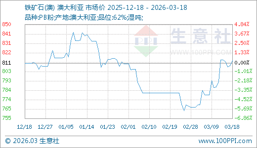 据生意社监测,铁矿石03月18日最新价格814.33元/吨,最近20天上涨5.82%,10天上涨4.48%。