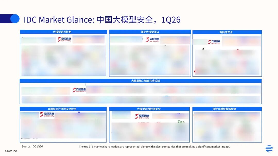 近日,全球领先的IT市场研究和咨询机构发布“中国大模型安全,2026Q1”与“中国安全智能体,2026Q1”两份重磅市场格局报告,全面描绘并解析了中国AI安全领域的竞争格局与发展态势。凭借在数字安全与人工智能两大领域的深厚积累与领先优势,安恒信息成功入选两份报告的核心代表厂商名单,再次彰显其在前沿安全技术赛道的行业影响力与市场地位。