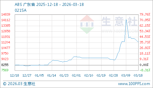 据生意社监测,ABS 03月18日最新价格11266.67元/吨,最近20天上涨25.05%,60天上涨27.49%,90天上涨36.48%。
