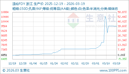据生意社监测,涤纶FDY03月19日最新价格9578.33元/吨,最近20天上涨27.94%,30天上涨28.65%,60天上涨37.13%,90天上涨39.80%。