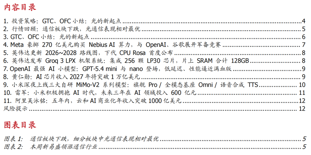2026年3月中旬,AI算力与光通信两大顶级盛会——GTC 2026与OFC 2026相继落幕,两场大会共同勾勒出光通信产业的新坐标与新起点,厘清了市场对光通信的认知误区,实现了预期的纠偏。