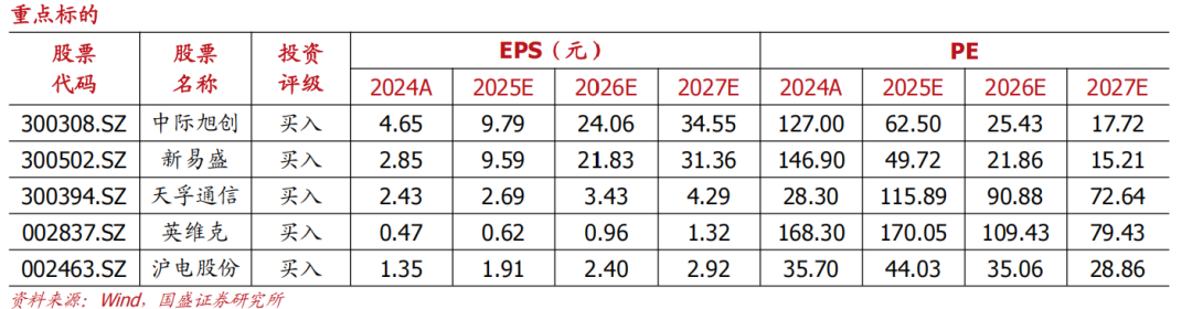 我们继续看好光+液冷+太空算力,这三个方向按产业发展阶段,其所对应的风险偏好依次提升。继续推荐算力产业链相关企业如光模块行业龙头中际旭创、新易盛等,同时建议关注光器件“一大五小”天孚通信+仕佳光子/太辰光/长芯博创/德科立/东田微,建议关注国产算力产业链,如其中的液冷环节如英维克、东阳光等。