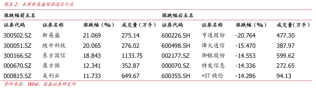 本周受益于CPO概念,新易盛上涨21%,领涨板块;受益于光伏设备概念,琏升科技上涨20%;受益于虚拟电厂概念,东方国信(维权)上涨19%;受益于芯片概念,盈方微上涨12%;受益于绿色电力概念,美利云上涨12%。