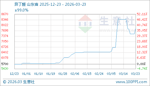 异丁醛03月23日最新价格7833.33元/吨,最近20天上涨21.76%,60天上涨36.23%,90天上涨37.43%。