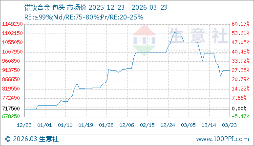 据生意社监测,镨钕合金03月23日最新价格915000.00元/吨,最近60天上涨10.91%,90天上涨27.53%。