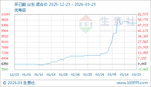 环己酮03月23日最新价格9600.00元/吨,最近20天上涨24.68%,30天上涨36.41%,60天上涨46.56%,90天上涨51.18%。