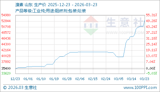 据生意社监测,溴素03月23日最新价格56000.00元/吨,最近5天上涨11.11%,10天上涨18.64%,20天上涨39.65%,60天上涨41.77%,90天上涨58.19%。