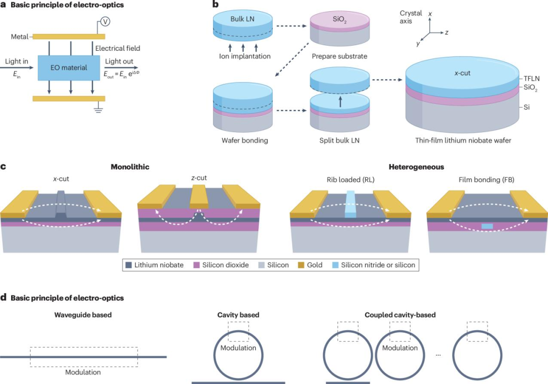 薄膜铌酸锂(TFLN)凭借良好的线性电光效应,有望成为下一代高速光信号主流调制材料。铌酸锂(LiNbO₃)集电光、声光和非线性光学等物理特性于一身,传统的铌酸锂体块状器件尺寸大且驱动电压较高,而通过离子注入和直接键合工艺制备的铌酸锂单晶薄膜,保在留铌酸锂体材料原有的优良物理特性的同时,提供了更高的折射率对比度,并大幅提升了光子器件的集成度。