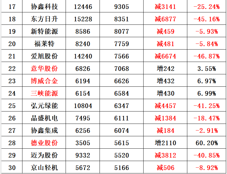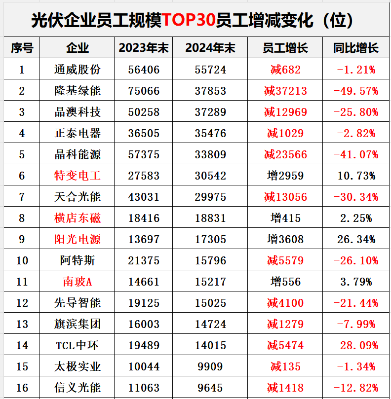 我们从下表可以看到,2024年,光伏企业员工规模TOP30的企业中,只有8家企业员工规模增长;其他22家企业均不同程度减员。包括隆基、晶科和天合等几家龙头,减员都以万人计,以稳健著称的晶澳科技,也不得不裁掉近13000人;裁员占比规模较大的企业还包括爱旭股份(减46.87%)、弘元绿能(减41.25%)和迈为股份(减40.85%)。