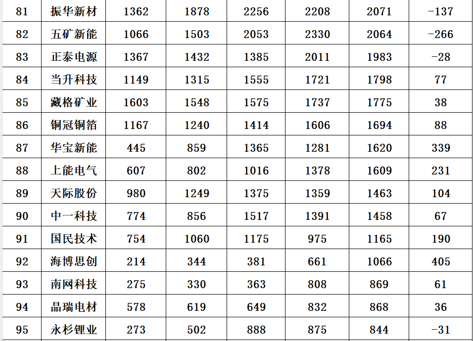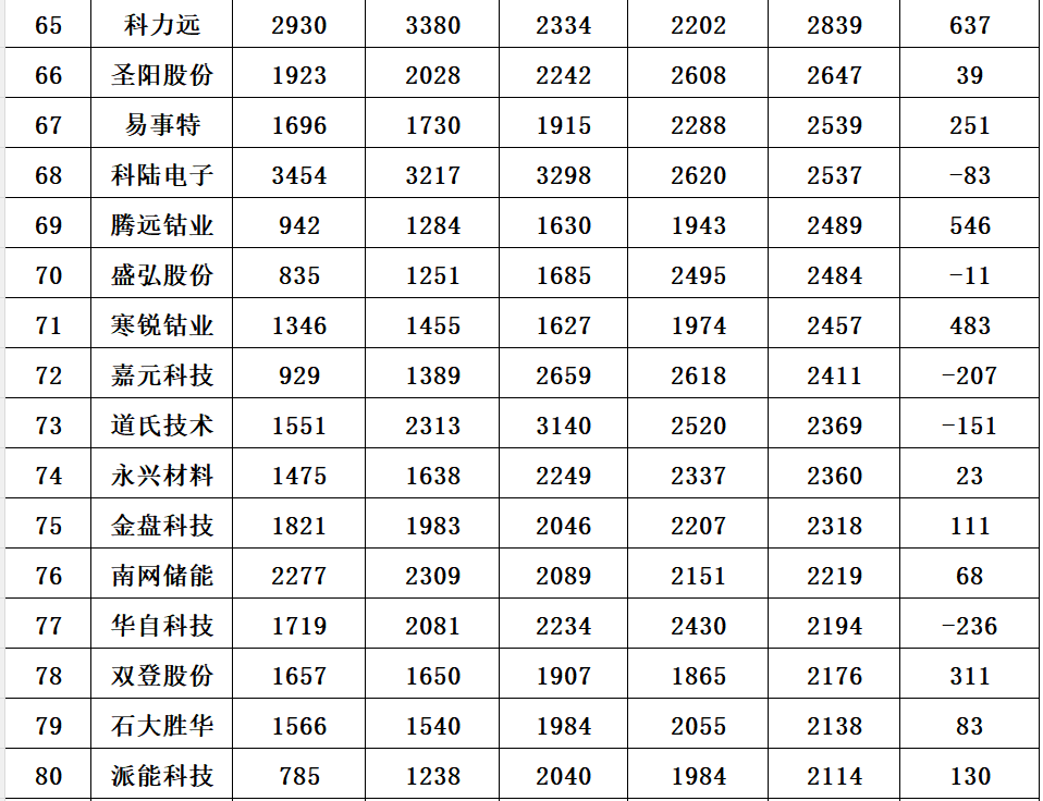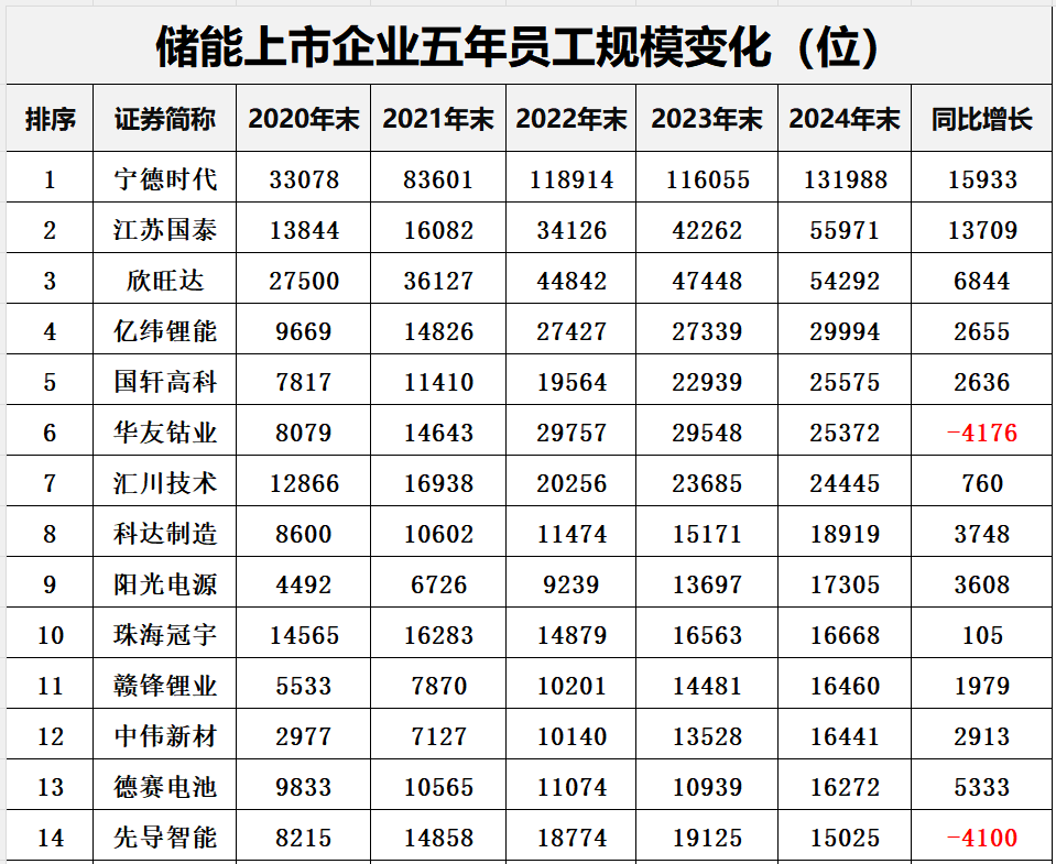 仅2024一年,这些企业员工规模又增长了5万多人。储能企业员工规模TOP25的企业中,2024年减员的企业仅有5家。这与光伏行业形成反差对比。其中,宁德时代一年增加员工15933人,江苏国泰增加13709人,欣旺达增加6844人,国轩高科增加2636人。(后附99家储能企业五年员工规模变化统计)