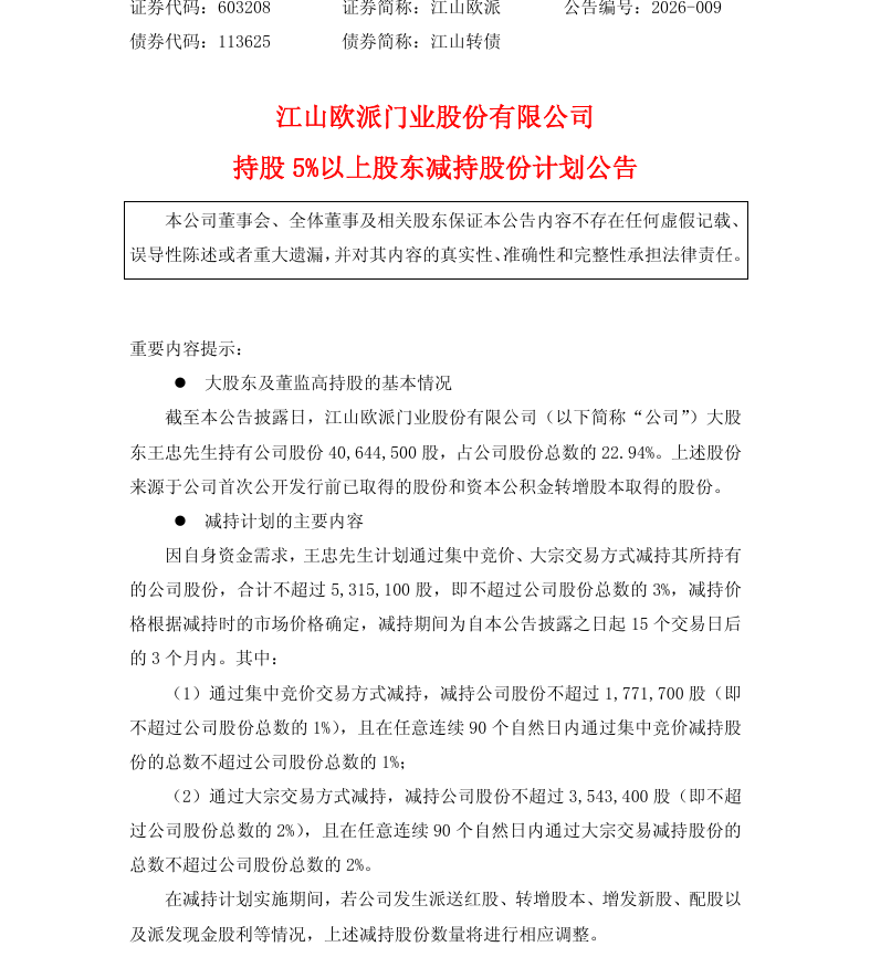 公告显示,本次减持原因均为股东自身资金需求,江山欧派强调,本次减持计划不会对公司治理结构、持续经营产生重大影响,也不会导致公司控制权发生变更。截至公告披露日,王忠持有江山欧派股份4064.45万股,占公司总股本22.94%,本次减持计划实施完成后,王忠持股数量将降至约3532.94万股。