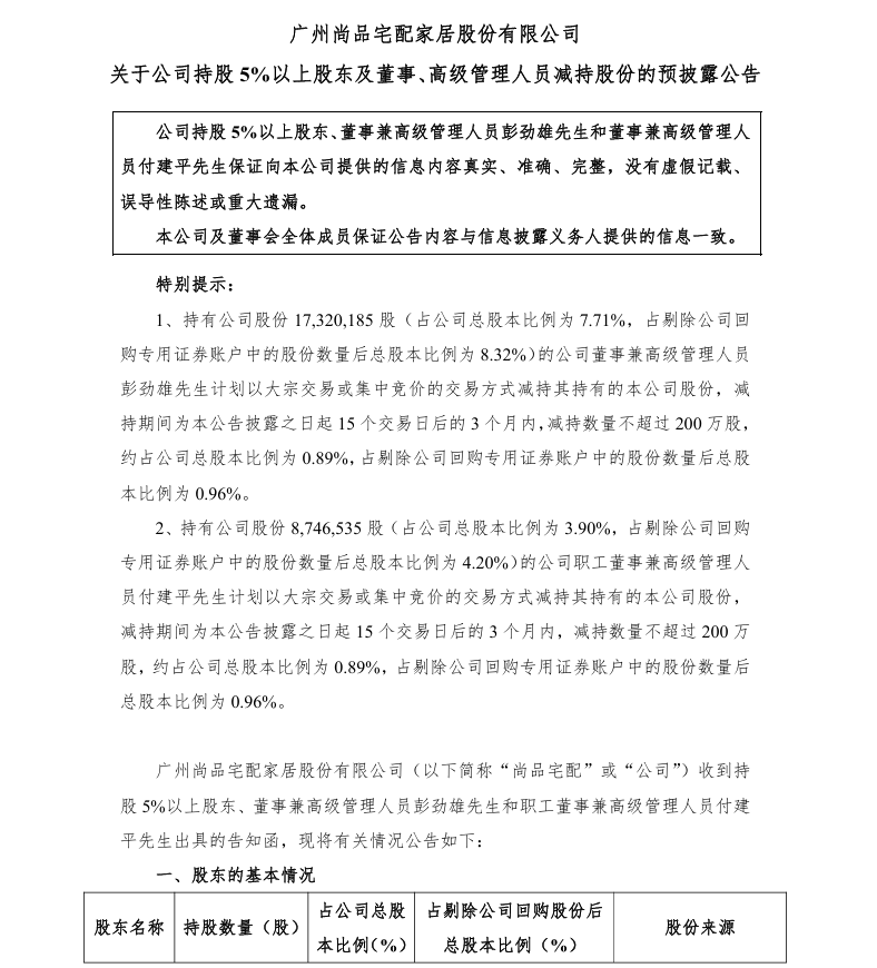 两位高管均表示,减持系出于自身资金安排需要。尚品宅配在公告中提及,此次减持安排不会对公司治理结构与持续经营造成重大影响,亦不会引发公司实际控制权发生变更。从持股情况来看,彭劲雄为公司持股5%以上股东,付建平持股比例为3.90%。本次减持计划实施完毕后,彭劲雄持股数量将降至1532.02万股,付建平持股数量将降至674.65万股。