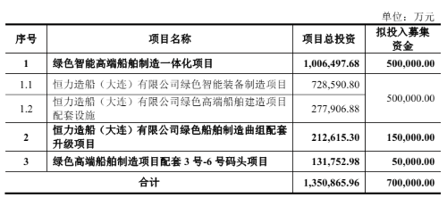 公告显示,本次募集金资金将用于绿色智能高端船舶制造一体化项目、恒力造船(大连)有限公司绿色船舶制造曲组配套升级项目以及绿色高端船舶制造项目配套3号-6号码头项目。