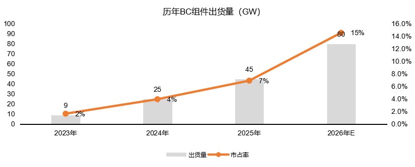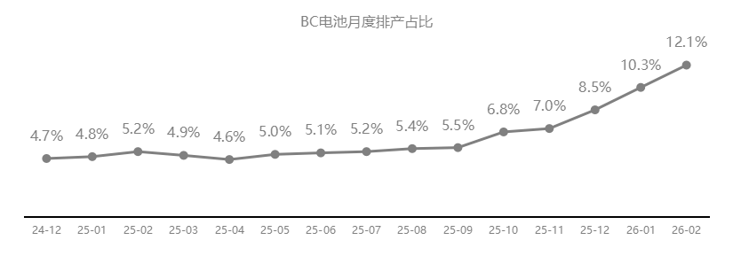 产能快速扩张:据不完全统计,截至2025年底,全球BC电池在建及落地产能已达88GW,月度平均产出约3.5GW、开工率约50%,在电池排产中占比约5.7%。进入2026年1-2月,BC电池月产出均超过4GW,开工率接近60%,在全行业电池排产中的占比从5.7%跃升至10-12%。在P型乃至大量TOPCon产线因产能过剩而停工减产、开工率低于30%的背景下,BC技术持续保持高开工率并逆势扩张,充分彰显了市场对高效产品的强烈需求。预计到2026年底,BC电池总产能或将增长至约150GW,产业规模效应全面显现。