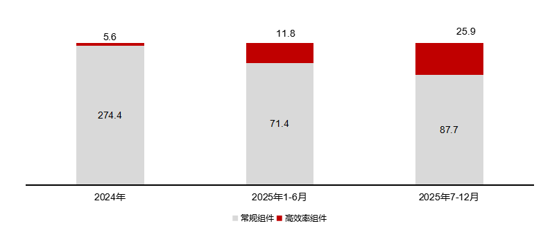 招标风向转变:2025年下半年以来,包含BC、HJT在内的高效率产品标段合计招标量达25.9GW,占比提升至24.1%。中国华能、中国华电、中国三峡组件集采、及多个项目招标均采取按转换效率划分标段的方式,高效率组件标段的下限均设置为23.8%,高效标段占比最低为48%,以央国企为主的电站开发企业对高效率产品的认可印证。这种招标模式的转变,正是对"摒弃'唯低价中标'"的积极响应。