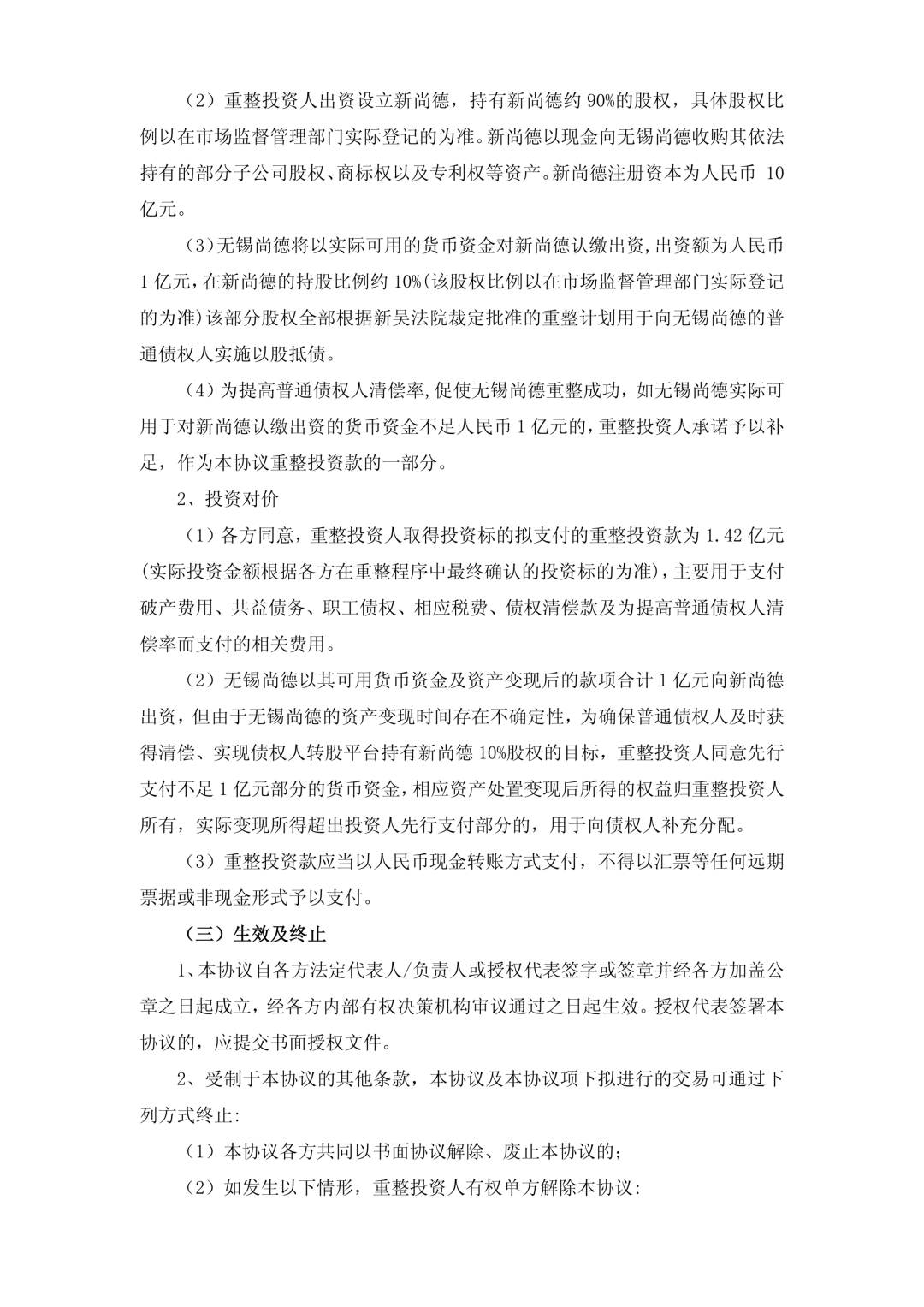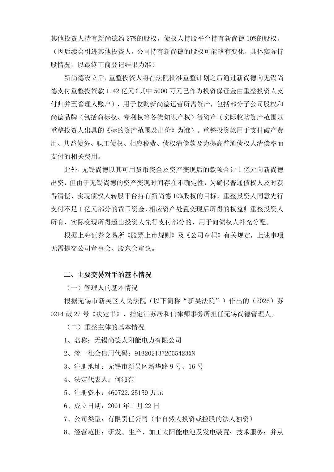 重整投资人与无锡尚德将共同设立新尚德(无锡尚德出资形成的股权用于向普通债权人实施以股抵债),新尚德注册资本为10亿元。其中,弘元光能将持有新尚德约63%的股权,并作为牵头投资人组建投资联合体,引进其他投资人,其他投资人持有新尚德约27%的股权,债权人持股平台持有新尚德10%的股权。