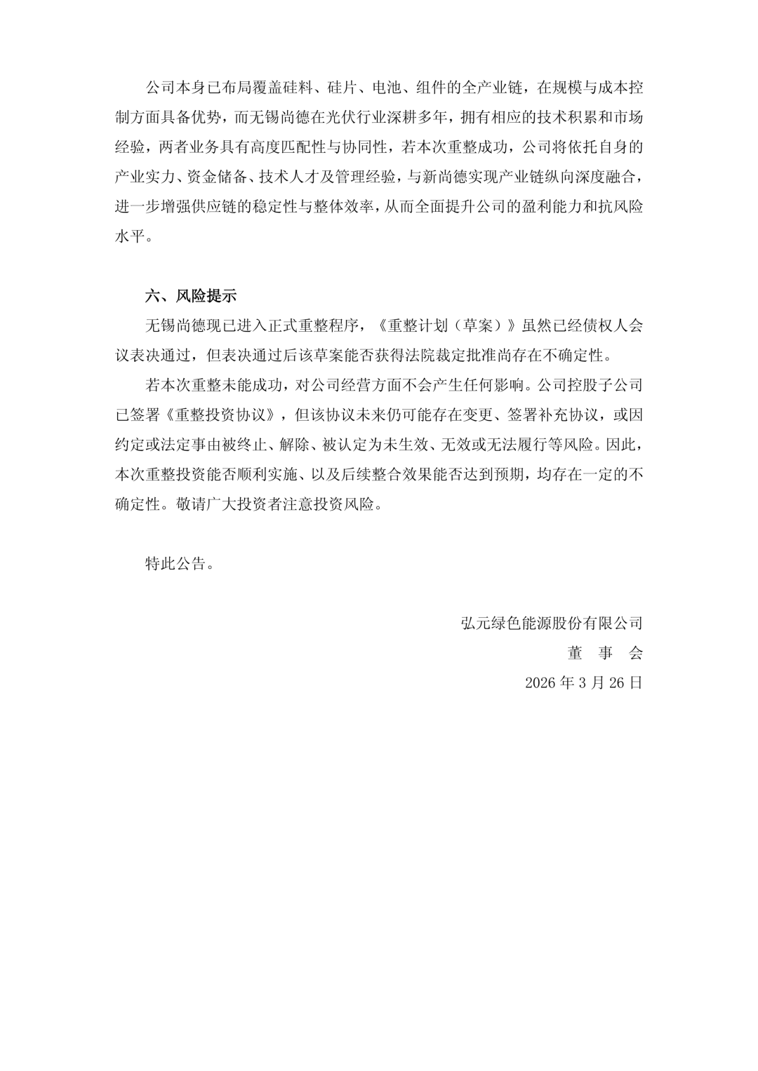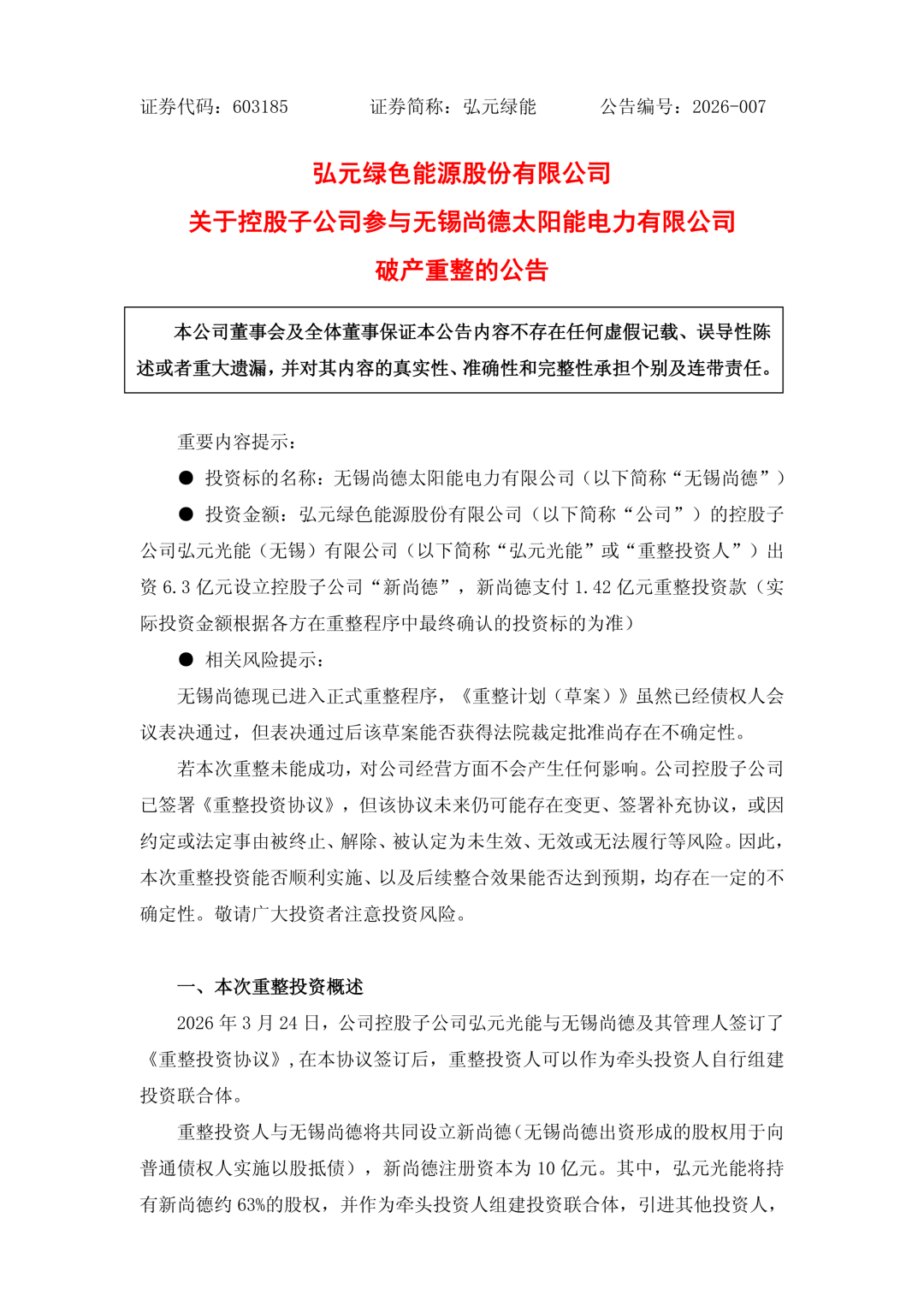 根据公告,弘元绿色能源股份有限公司的控股子公司弘元光能(无锡)有限公司出资6.3亿元设立控股子公司“新尚德”,新尚德支付1.42亿元重整投资款。